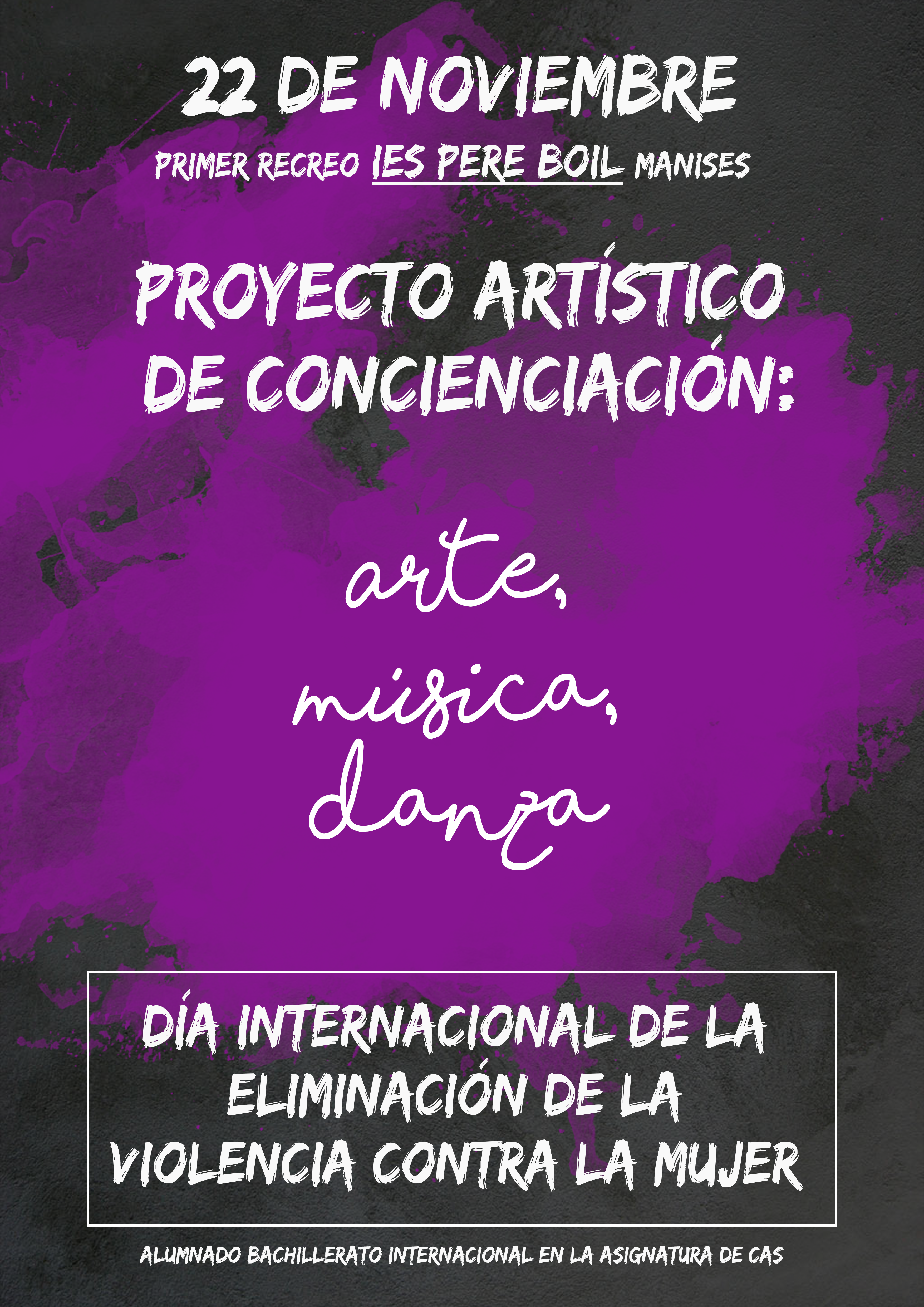 El dia 22 i 23 de novembre els alumnes de Batxillerat Internacional realitzaran un projecte de conscienciació artística (art, música i dansa) en el primer esplai per a visibilitzar el “Dia Internacional de l’Eliminació de la Violència contra la Dona”, que és el dia 25 de novembre.
