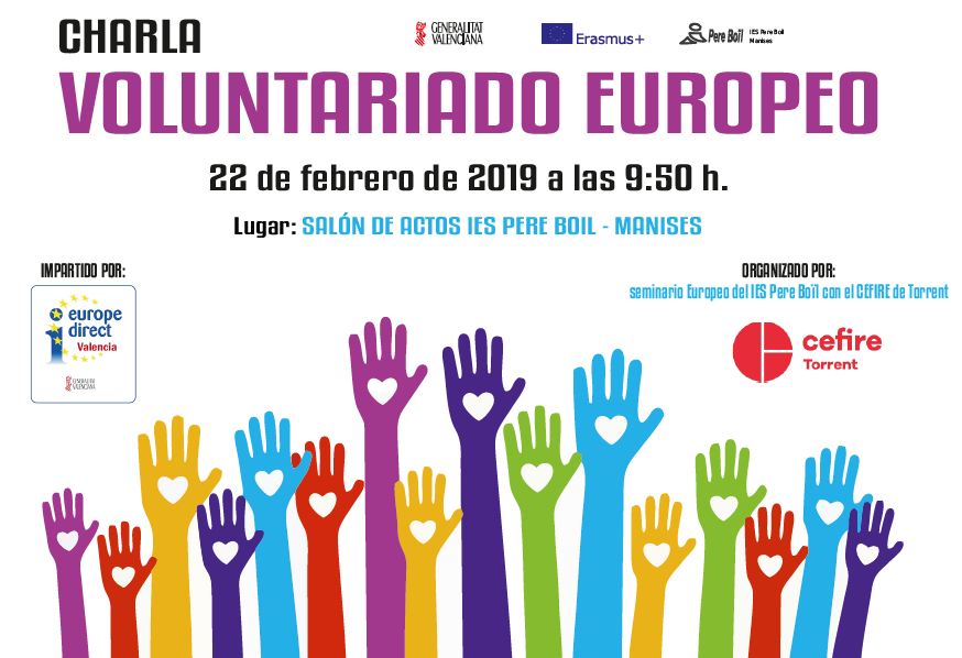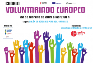 El dia 22 de febrer de 2019 (divendres) a les 9:50h en el Saló d’Actes del centre es realitzarà una xarrada sobre les possibilitats de realitzar voluntariat en Europa, impartit per Europe Direct.