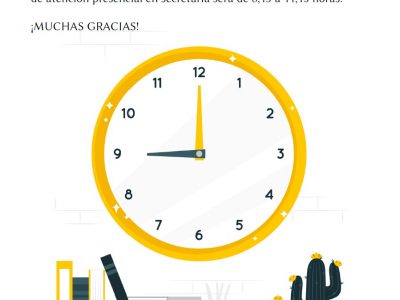Us informem que des del dilluns 23 de juny al 31 de juliol, l'horari d'atenció presencial en secretaria serà de 8,15 a 11,15 hores. Moltes gràcies!
