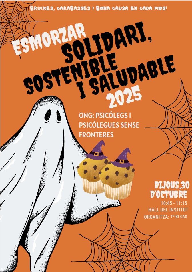 El dijous 30 d’octubre, l’alumnat de primer de BI organitzarà un esmorzar solidari, saludable i sostenible al hall de l’institut per a celebrar el dia de Halloween.